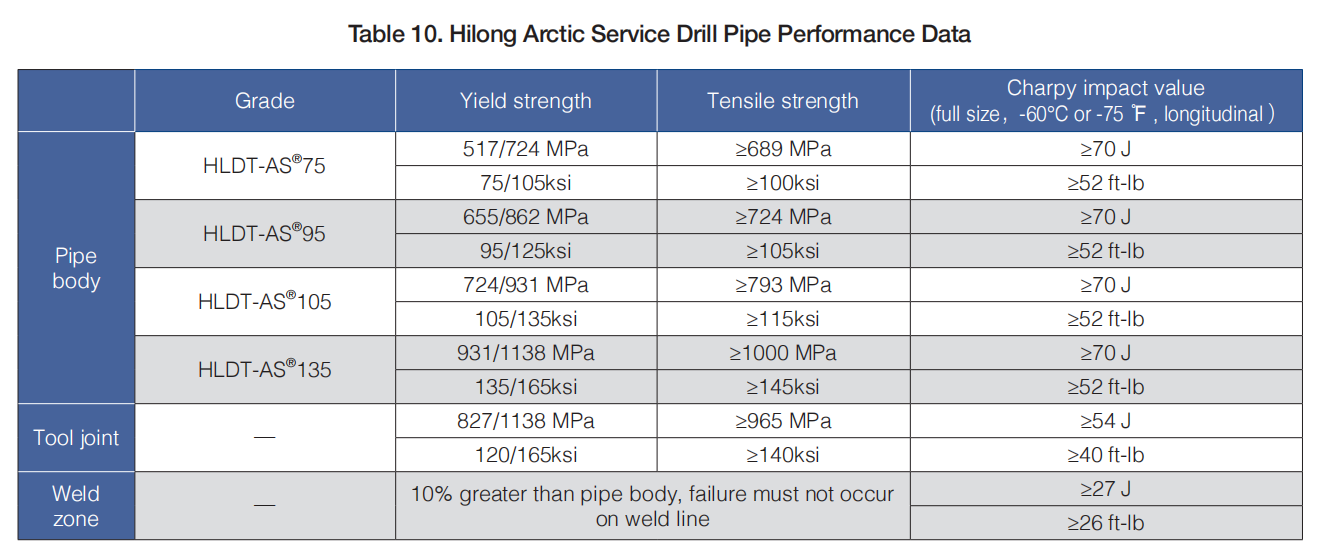 Hilong arctic service drill pipe is a type of proprietary drill pipe with capability to perform in extreme cold regions. Service temperature - 60 ℃ and above.