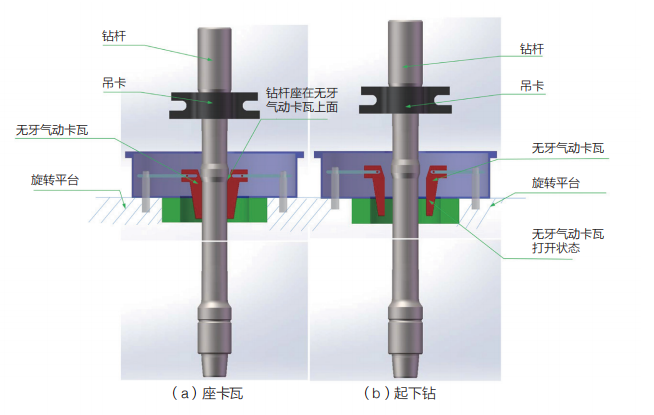 海隆零卡瓦咬傷快速起下鉆鉆桿,是專門為解決起下鉆作業(yè)時卡瓦牙咬傷鉆桿本體及雙吊卡作業(yè)效率低,勞動強(qiáng)度大等問題而設(shè)計開發(fā)的一種特殊產(chǎn)品。其特點是在 API 普通鉆桿的基礎(chǔ)上,距內(nèi)螺紋接頭端面一定位置處增加一個抬肩。在起下鉆時,鉆柱坐在氣動卡瓦上,重力由氣動卡瓦的承載滑塊軸向承載,管體表面無卡瓦咬痕,可有效降低管端刺穿風(fēng)險。另外,內(nèi)螺紋接頭上卸扣位置提高,方便上卸扣。